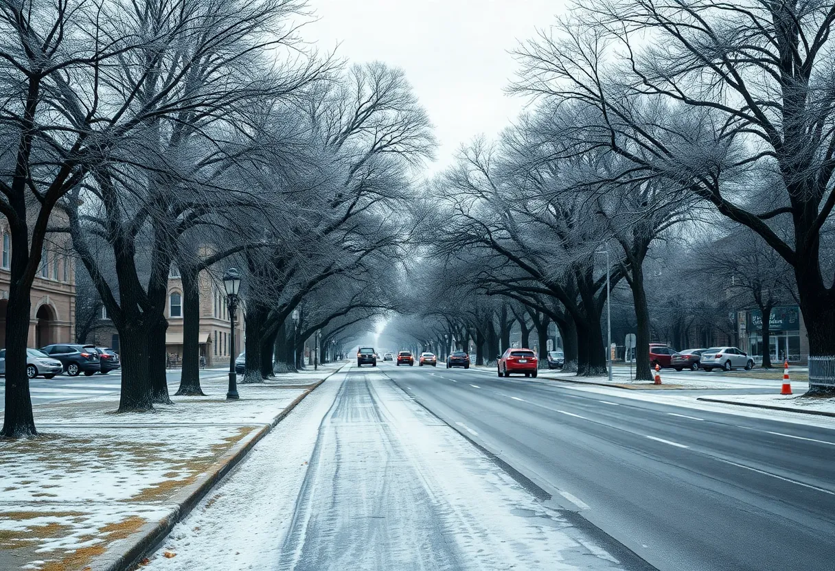 Empty San Antonio streets under a blanket of frost due to cold weather.