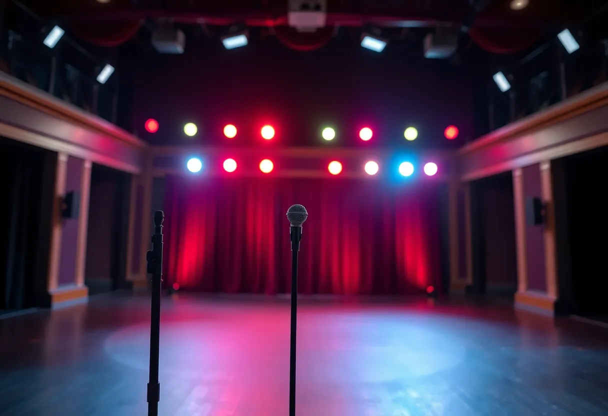 Stage set for a stand-up comedy performance at Majestic Theatre