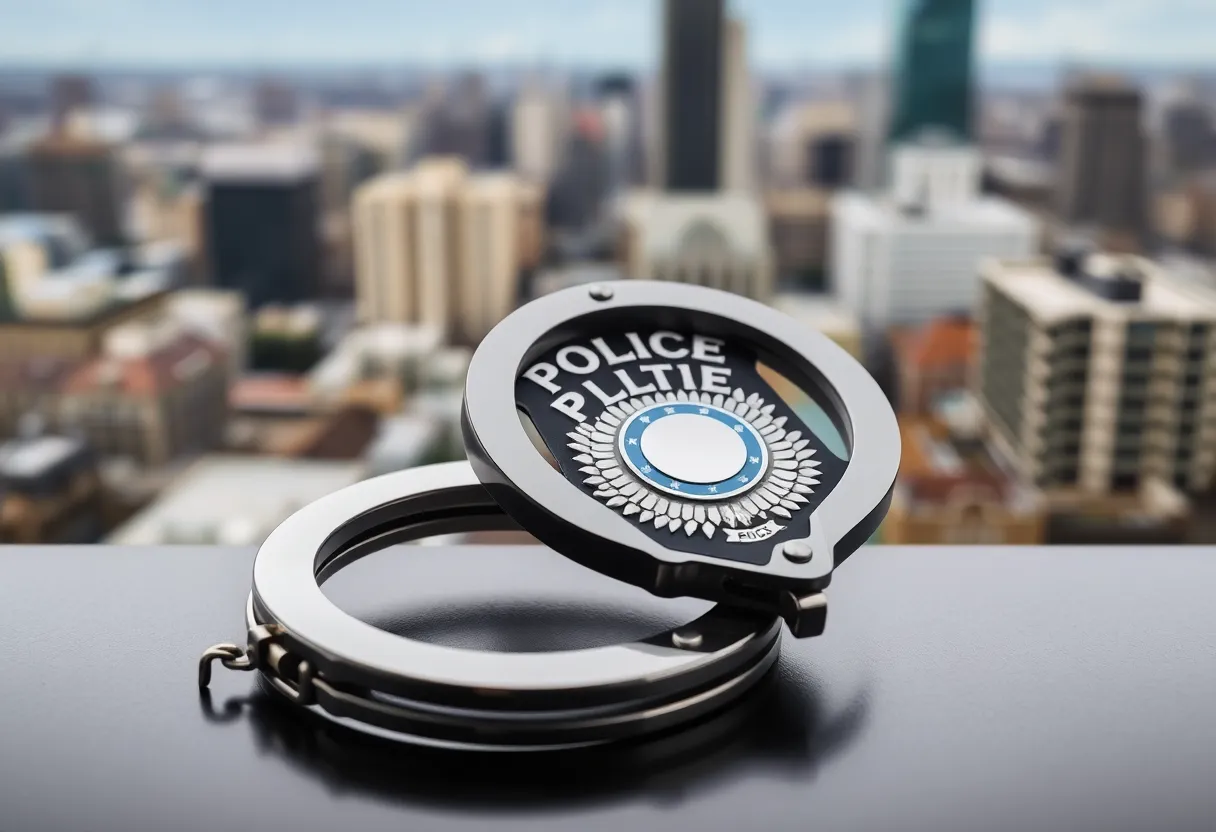 Close-up of a police badge and handcuffs on a table