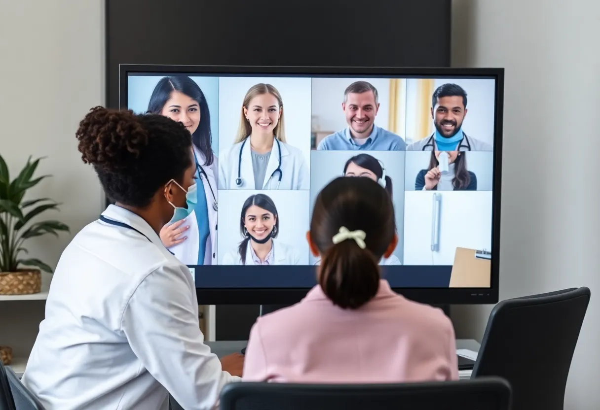 Healthcare professionals conducting a virtual consultation through a computer screen.